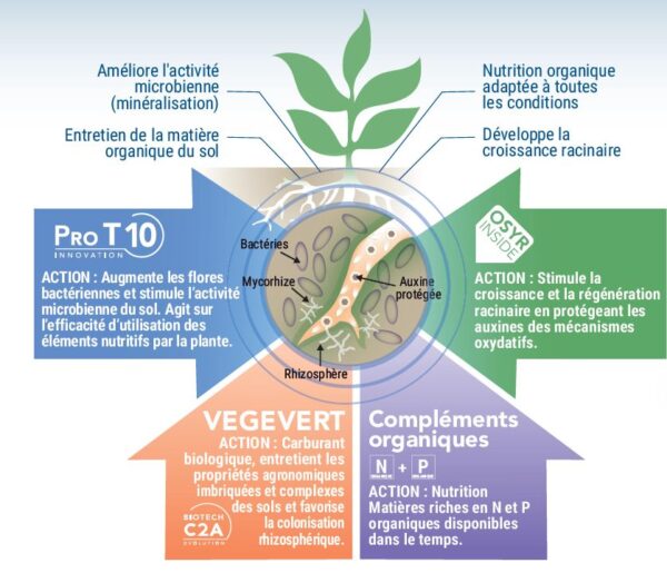 Associé à la base organique VEGEVERT, issue du process d’humification BIOTECH C2A, la colonisation rhizosphérique est alors favorisée.