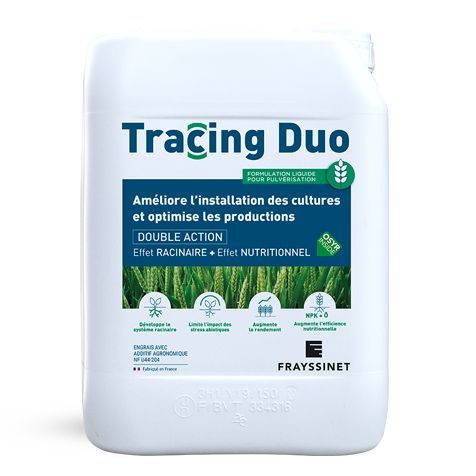 Appliquer en pulvérisation en dilution dans minimum 75 à 100 l d’eau. Ajouter Tracing Duo en dernier dans la cuve.