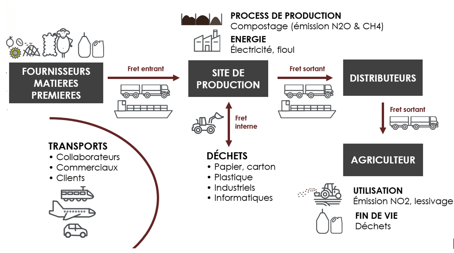 L’activité de FRAYSSINET étant majoritairement de la gestion de déchets d’origine agricole ou agroalimentaire, notre calcul commence à partir de la génération du déchet (matière première) et de son transport vers notre usine. En effet, il ne semble pas pertinent de prendre en compte toutes les émissions en amont de la génération du déchet, étant donné que celles-ci sont déjà prises en compte dans les bilans carbone des produits dont il est issu. Notre calcul se termine après l’utilisation de nos produits et prend en compte leur devenir dans les sols ainsi que la gestion des emballages.